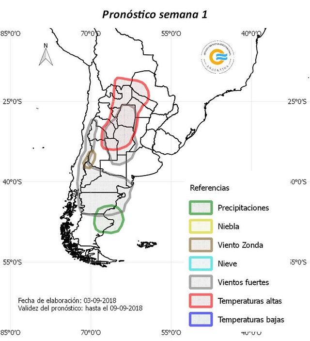 VIENTOS: entre esta tarde y el miércoles 5, se espera viento del sector norte con velocidades entre 30-40 km/h, en el este de La Rioja, este de Catamarca, sur de Santiago del Estero, Córdoba, La Pampa, este de Mendoza y oeste y sur de la provincia de Buenos Aires. Para mañana se espera, en el sur de Mendoza, vientos del sector oeste con velocidades entre 30-50 km/h, con ráfagas. Entre el miércoles 5 y jueves 6, se esperan vientos del sector oeste con velocidades entre 40 y 60km/h en Neuquén, Río Negro, sur de la provincia de Buenos Aires y Chubut y probabilidad de viento Zonda el miércoles 5 en la zona cordillerana del sur de Mendoza y norte de Neuquén.