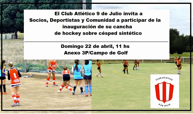 El próximo domingo a las 11 hs. el Club Atlético 9 de Julio inaugurará luego de un año de campaña, esforzado trabajo y una gran inversión, la primera cancha sobre césped sintético de nuestra Ciudad.