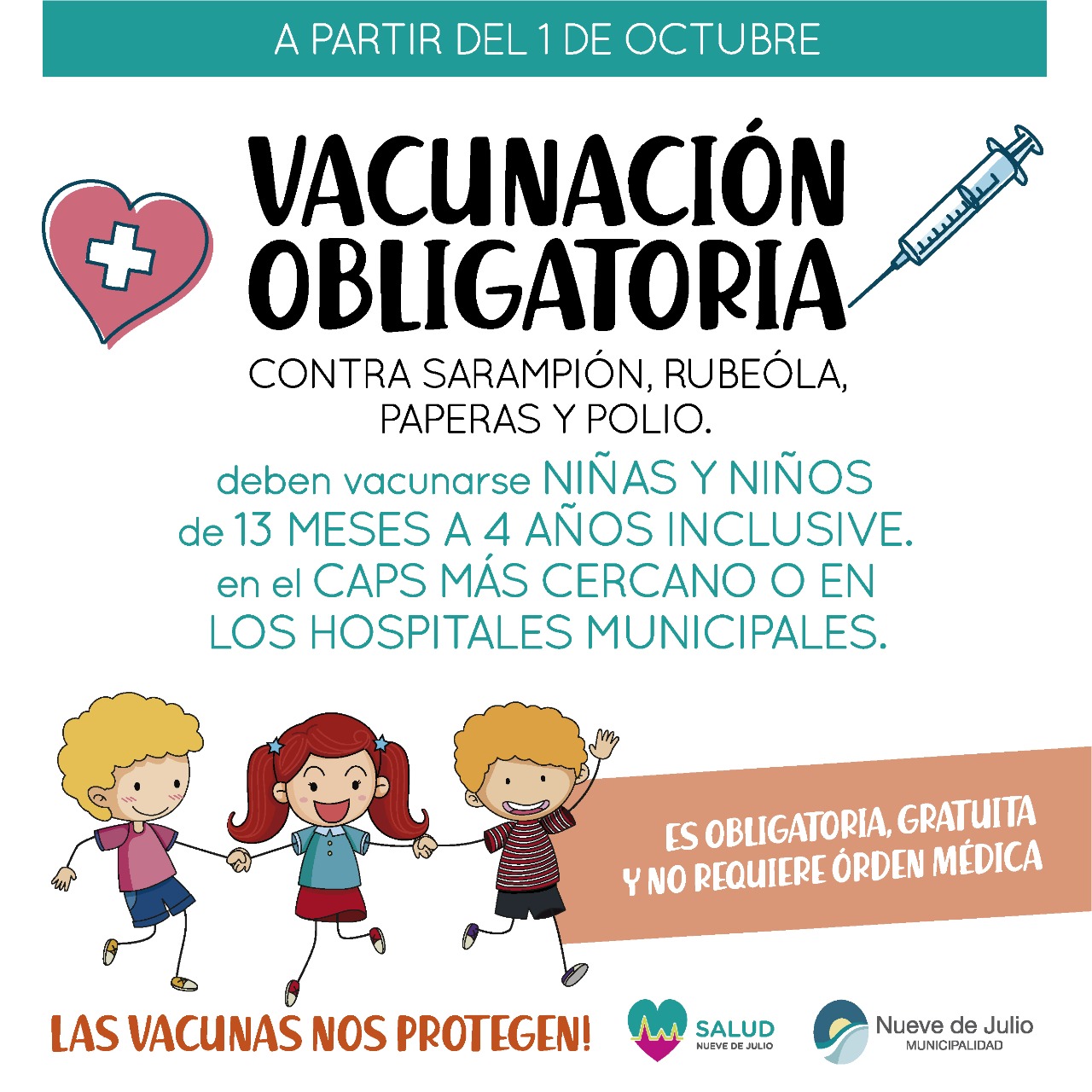 Desde la Secretaría de Salud de la Municipalidad de Nueve de Julio se recuerda que a partir del 1° de octubre comenzará la Campaña Nacional de Vacunación Sarampión, Rubéola Paperas y Polio. La vacuna es obligatoria para todos los niños de 13 meses a 4 años inclusive.