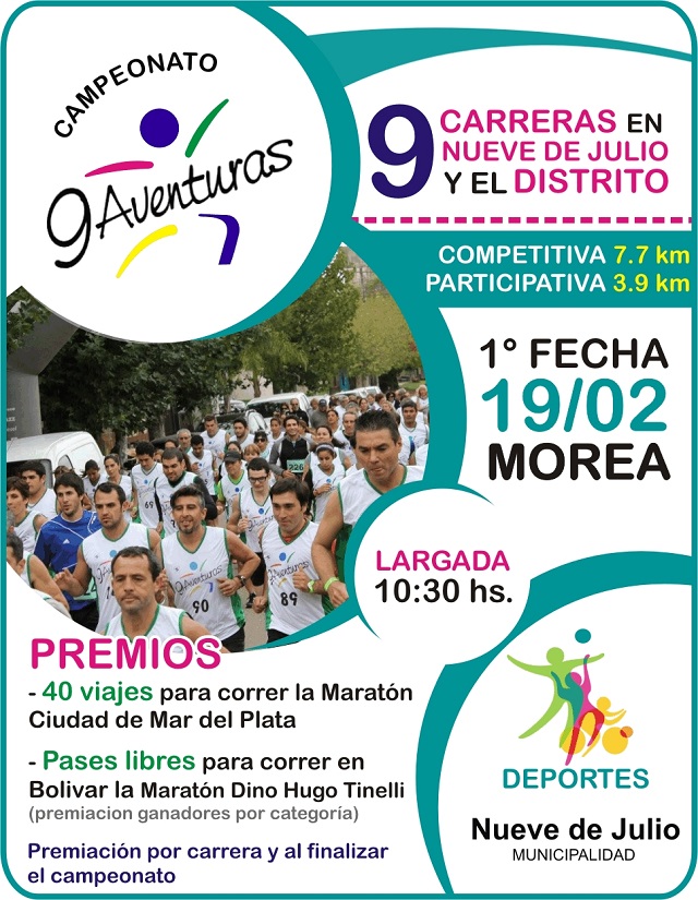 9 AVENTURASLa Municipalidad de Nueve de Julio, a través de la Dirección Gral. de Deportes, recuerda que el este domingo 19, desde las 10,30 hs.,  dará inició la segunda edición del campeonato atlético “9 Aventuras”, comprendiendo maratones de diferentes características en la ciudad y en cada una de las localidades del distrito.