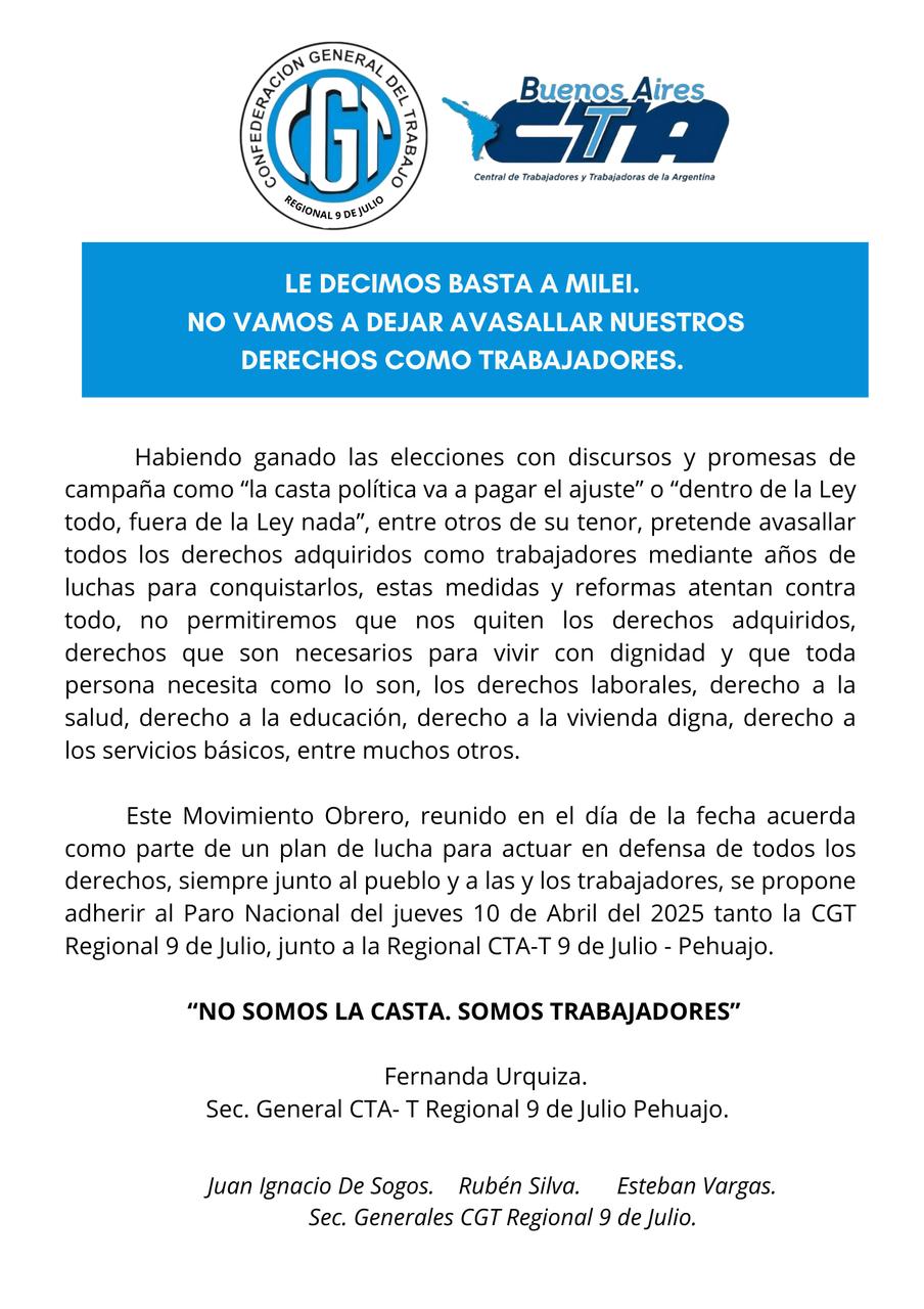 LocalesComunicado CGT-CTa 9 de Julio sobre el Paro9 abril 2025 FacebookTwitterPinterestWhatsAppImpresiónTelegram Últimas noticias Localesadmin - 13 diciembre 2025Luis Moos: “La ética no se predica, se practica”Por los votos obtenidos el último 7 de septiembre, el espacio de La Libertad Avanza (LLA) se consolidó sumando... Regionales La provincia de Buenos Aires registra su peor segundo trimestre laboral desde 2022 admin - 13 diciembre 2025 Agro Es oficial la baja de 2% de las retenciones admin - 13 diciembre 2025 Deportes Racing y Estudiantes definen la final del Torneo Clausura 2025 en Santiago del Estero Martin Parise - 13 diciembre 2025 Locales Campaña de concientización sobre VIH/SIDA: información y prevención admin - 13 diciembre 2025 Noticias relacionadas Luis Moos: “La ética no se predica, se practica” Locales admin - 13 diciembre 2025 Campaña de concientización sobre VIH/SIDA: información y prevención Locales admin - 13 diciembre 2025 Amenazas y heridas graves de un vecino a otro Locales admin - 12 diciembre 2025 Nueva edición de la Fiesta Provincial del Lechón en Morea Locales admin - 12 diciembre 2025