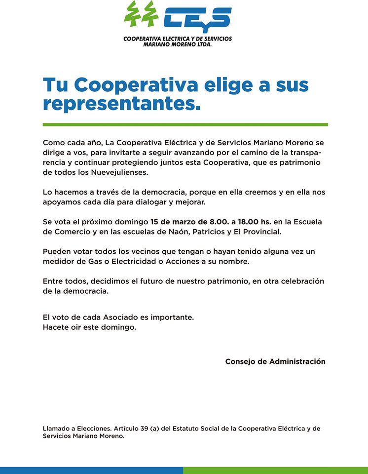 En cumplimiento del Estatuto Social y de la Ley Nacional Nº 20.337, la Cooperativa Eléctrica y de Servicios “Mariano Moreno”, convocó a sus asociados para el día 15 de marzo de 2.020, entre las 8,00 y las 18,00 horas, en el local de Avda. Cnal. Pironio Nº 1528 de esta ciudad, a las Asambleas Electorales de Distritos, en sus diferentes sectores.