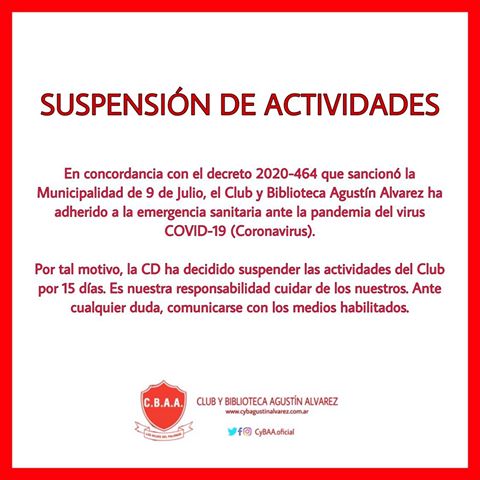 GeneralComunicado del club Agustín Alvarez14 marzo 2020 FacebookTwitterPinterestWhatsAppImpresiónTelegram El Club y Biblioteca Agustín Alvarez comunica a la sociedad que suspende todas sus actividades.Últimas noticias Agroadmin - 8 noviembre 2025Provincia acusa a Nación de no aportar fondos para inundadosEl ministro de Desarrollo Agrario bonaerense, Javier Rodríguez, denunció que el Gobierno nacional no ha enviado aportes económicos para... General Milei promueve inversiones en Nueva York y cierra su gira en Bolivia admin - 8 noviembre 2025 Locales Ratifican denuncia contra la jueza Valinoti admin - 8 noviembre 2025 Locales Gabriela Tiani: «El tiempo dirá» admin - 8 noviembre 2025 General Pago récord al FMI, impacto en reservas y expectativa cambiaria admin - 8 noviembre 2025 Noticias relacionadas Milei promueve inversiones en Nueva York y cierra su gira en Bolivia General admin - 8 noviembre 2025 Pago récord al FMI, impacto en reservas y expectativa cambiaria General admin - 8 noviembre 2025 Los únicos medallistas del agua General admin - 7 noviembre 2025 El dólar oficial bajó a mínimos de tres semanas: ya acumuló un retroceso de $77 desde las elecciones General admin - 7 noviembre 2025