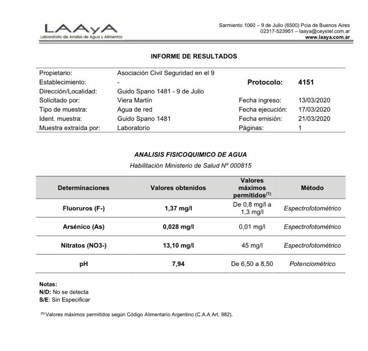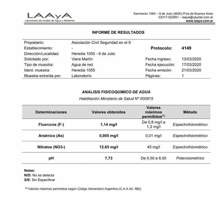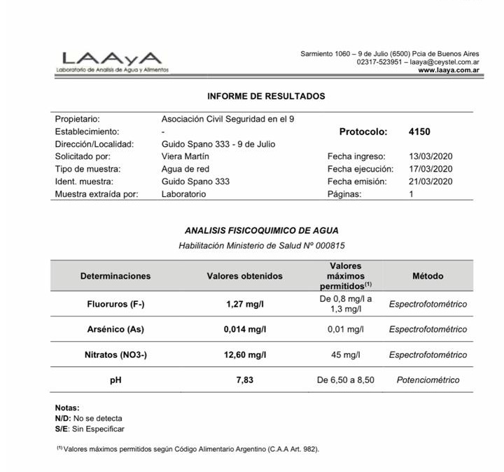 AMIGOS/VECINOS: en el día de hoy recibimos el resultado de análisis de agua que previamente habíamos solicitado. Que nos motivó a pedir dichos análisis? Algunos vecinos expresaron su preocupación sobre la potabilidad o no del agua, en ese sentido solicitamos a la dirección de Bromatologia que nos informara el resultado de las muestras que ellos realizan mensualMente, esa información nunca nos fue proporcionada a pesar de ser pública. Esta semana se pudo leer en distintos medios de comunicación que el Consejo Deliberante aprobó un pedido de informes donde se solicitaba la publicación de los resultados. Ante la falta de información desde la “asociación civil seguridad en el 9” decidimos realizar el estudio a nuestro costo, y el resultado es el siguiente. Se tomaron tres muestras una en calle Heredia al 1000 donde los resultados están todos bajo los parámetros que indica el Código Alimentario Argentino, en calle G Spano al 300 donde la cantidad de arsénico supera levemente lo establecido en el código y en la calle G Spano al 1400 donde los valores de arsénico duplican el valor indicado en el código y el de flúor lo supera mínimamente. Adjunto el detalle que nos envío el