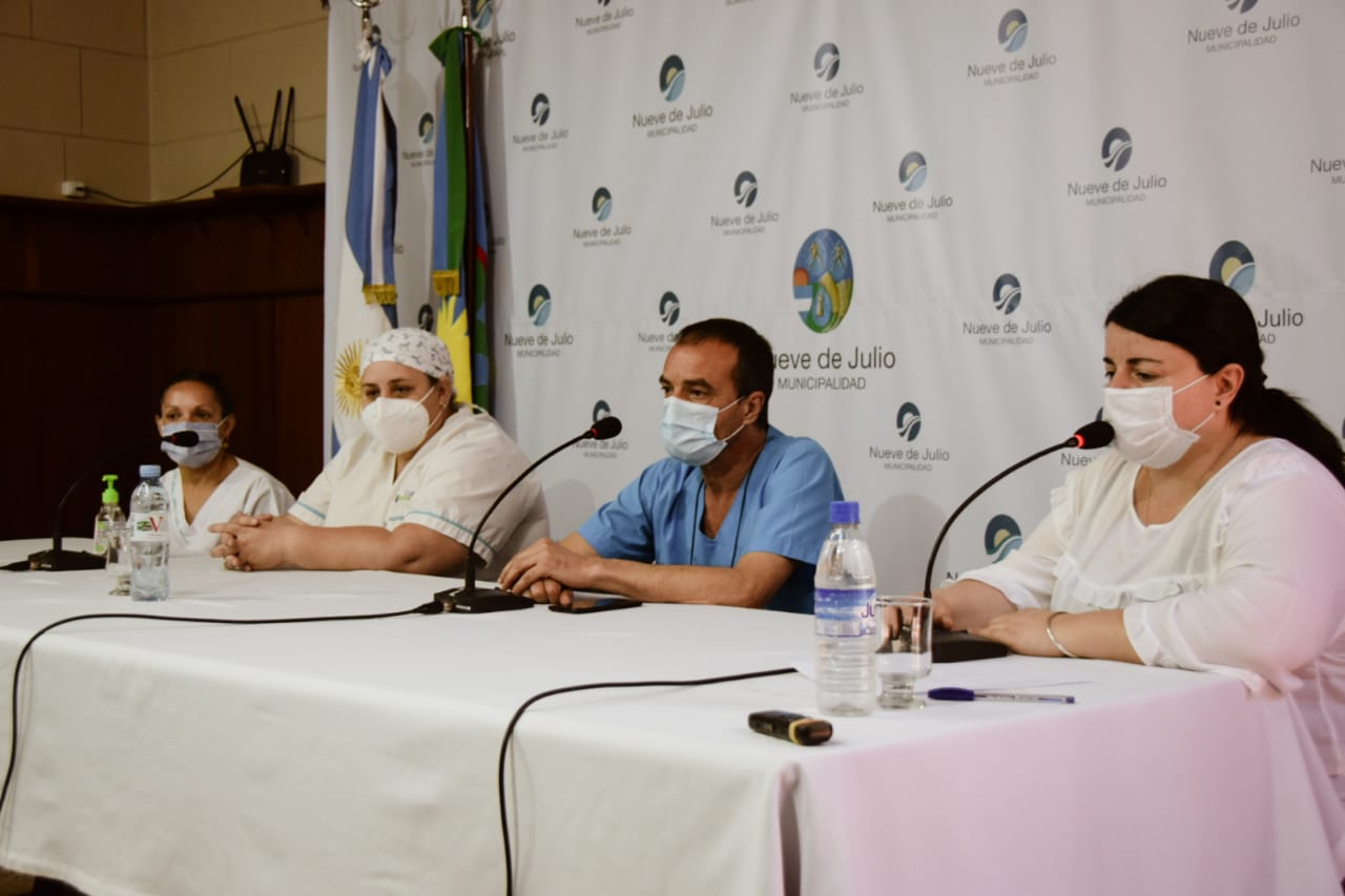 Con la particularidad de que en esta oportunidad se contó con la presencia de dos profesionales de la salud, -quienes mostraron los equipos que se utilizan para la atención de pacientes con Covid-19, con la finalidad de concientizar acerca de su sacrificado trabajo diario en el cuidado dela población, instando a la misma a adoptar medidas de prevención y evitar el relajamiento- el Comité de Crisis en Salud de Nueve de Julio ofreció este mediodía una nueva conferencia de prensa para informar sobre la situación epidemiológica en el contexto de la pandemia de Covid-19.