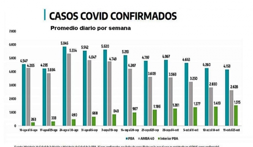 En el conurbano, sólo los partidos del cuarto cordón registraron un incremento neto semanal de nuevos casos ligeramente superior al de la semana previa, con 919 nuevos casos frente a 893 en la semana anterior. En el primer cordón se registraron 6067 nuevos casos en la semana del 24/10 contra 7033 de la semana anterior. En el segundo cordón, el número de nuevos contagios en la última semana fue de 8741 contra 8893 de la semana previa. En el tercer cordón, 1559 contra 1779; y en el Gran La Plata, 1147 nuevos casos en la semana del 24/10 contra 1345 en la del 17/10.