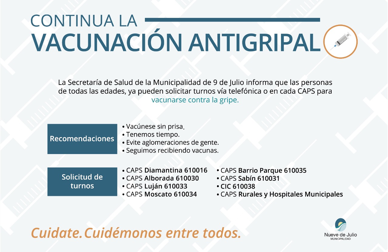 A través de la Secretaría de Salud de la Municipalidad de Nueve de Julio, se está llevando adelante la campaña de vacunación antigripal 2021.