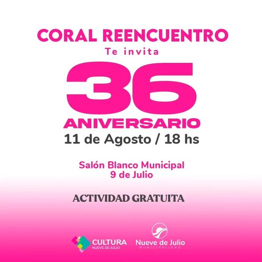 La Dirección de Cultura de la Municipalidad de Nueve de Julio invita a participar del concierto del 36 aniversario de Coral Reencuentro.