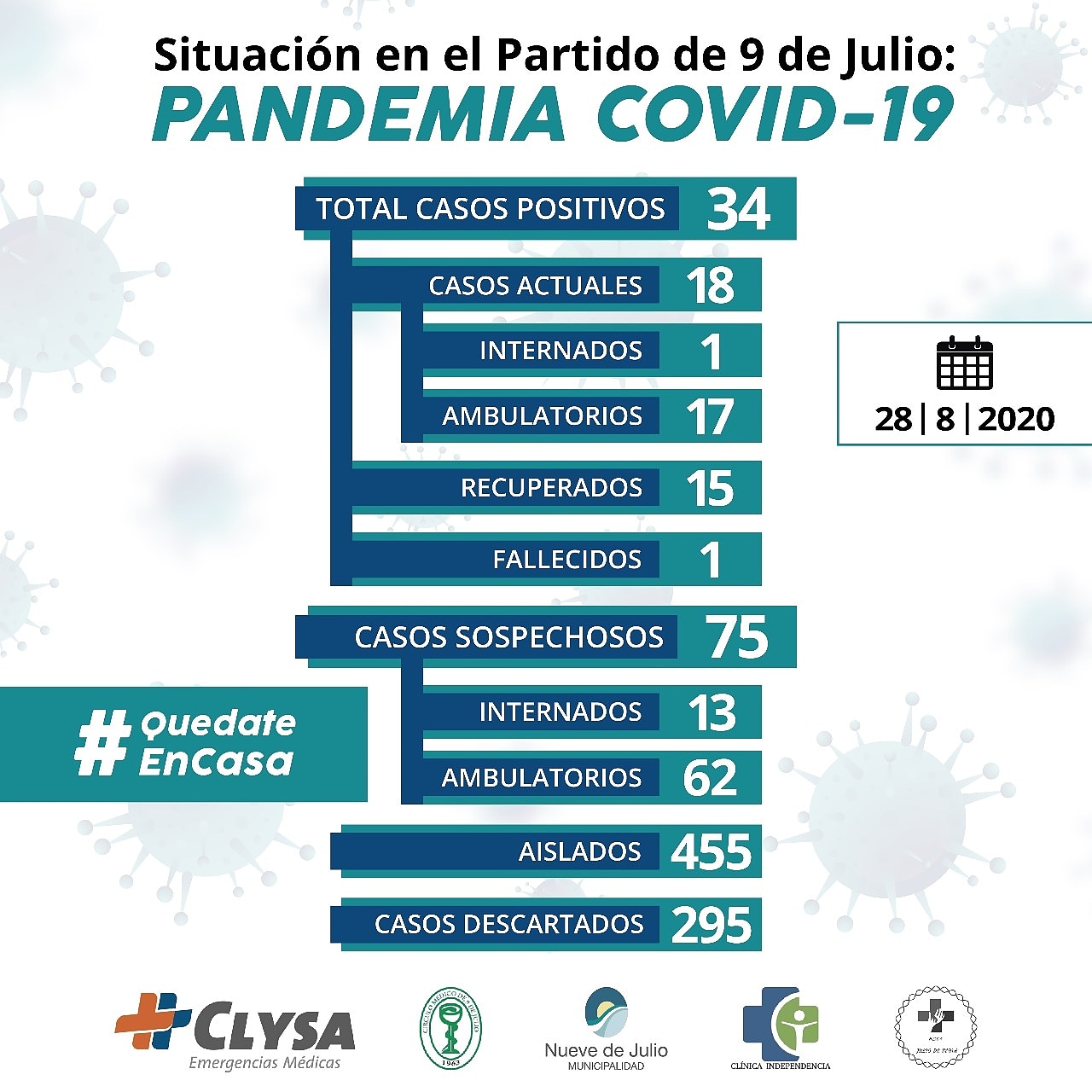 Los casos confirmados desde el comienzo de la pandemia son treinta y cuatro (34) de los cuales dieciocho (18) están activos, uno (1) falleció y quince (15) ya se encuentran recuperados, en tanto se han descartado doscientos noventa y cinco (295).