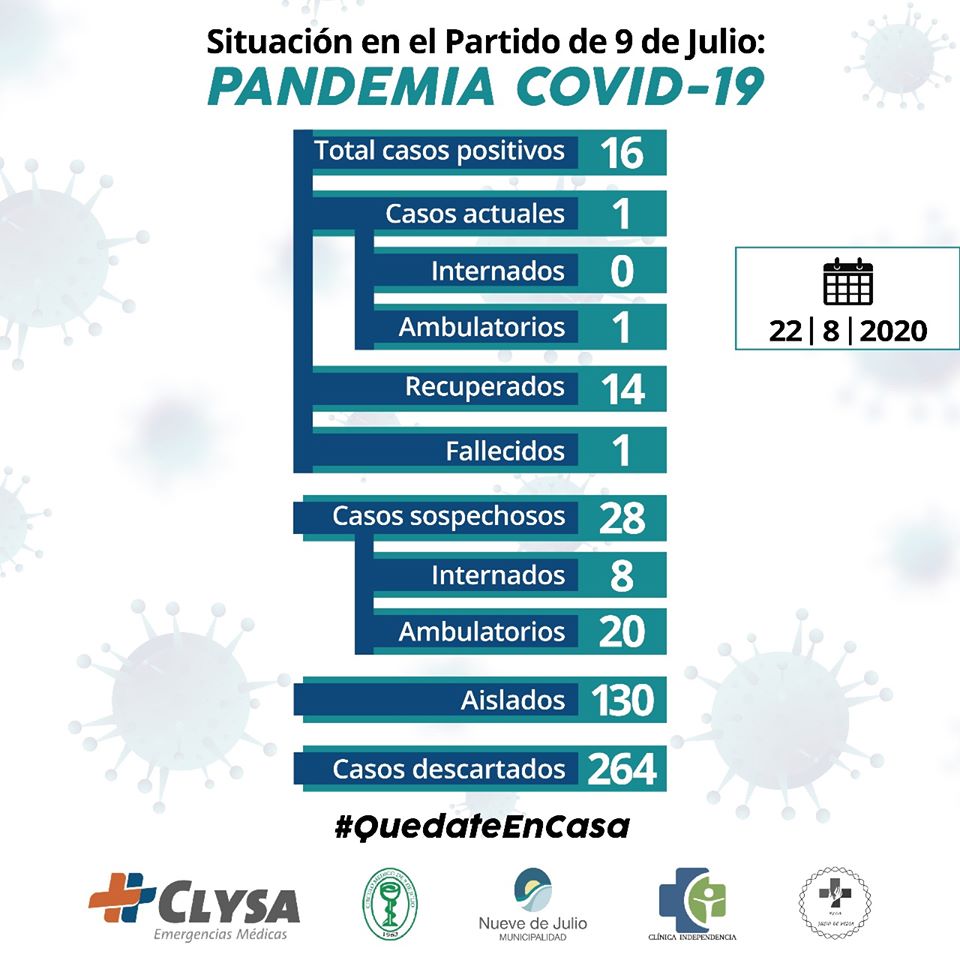 Los casos confirmados desde el comienzo de la pandemia son dieciséis (16) de los cuales uno (1) está activo, uno (1) falleció y catorce (14) ya se encuentran recuperados, en tanto se han descartado doscientos sesenta y cuatro (264).