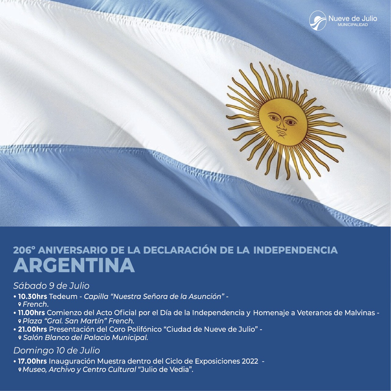 Con motivo de conmemorarse el sábado 9 de julio el 206 Aniversario de la Declaración de la Independencia, se desarrollarán en esa fecha los actos oficiales, organizados por la Municipalidad de Nueve de Julio, los que tendrán como ámbito la localidad de French, con el siguiente cronograma: