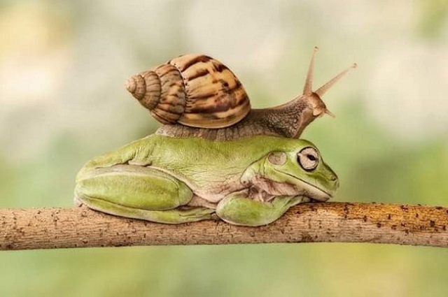De regreso a su casa, Eva caminaba por la avenida cuando descubrió que en una librería, la vidriera estaba llena de libros de animales, por pura curiosidad y acordándose de lo que siempre decían, se acercó y vio que en la contratapa de un libro había un sapo de un repugnante verde claro, dormitando sobre una rama, con cara de despreocupación y sobre él, el más lento de los animalitos que ella había visto, un caracol, encima el más práctico porque sobre si, llevaba su casita, lo que hacía que no se usara transporte y agilizara la cuestión. Se quedó mirando ese caracol tranquilo, inmutable, pero con las antenas atentas a una imprevista reacción del sapo, que era casi imposible porque se lo notaba aprobando la planta alta, que había diseñado el caracol.