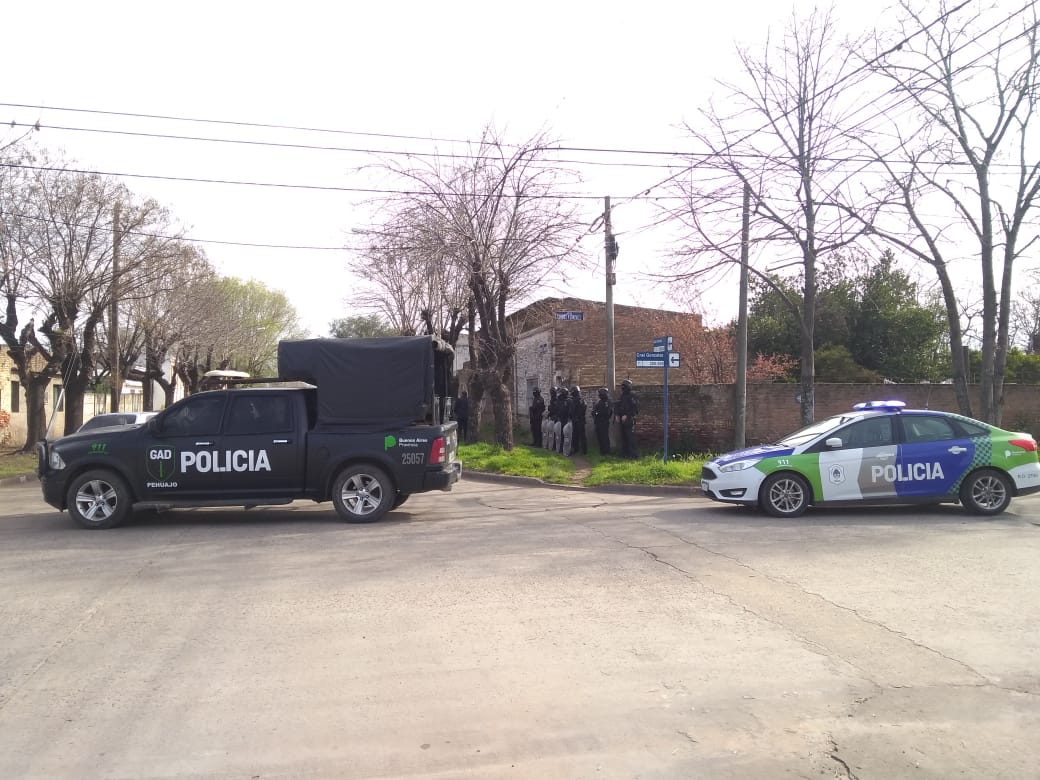 Informe policial: En horas de la madrugada personal policial de la estación de Policía de 9 de Julio, a raíz de un llamado al 911 se constituye a arteria Frondizi al 300 en virtud que en el lugar habría tres masculinos con intenciones de ingresar a una vivienda que metros antes de arriba observan a tres sujetos salir del interior de la vivienda, uno de los cuales se da a la fuga, mientras que los restantes dos masculinos de 17 y 19 años de edad, gracias al rápido accionar del personal que recorría en los móviles, los aprehende en el lugar incautandosele un arma blanca de fabricación casera tipo faca y un cuchillo de cocina. Entrevistado con el propietario de la vivienda, sujeto de 33 años, refiere que los sujetos ingresaron al patio de la vivienda previa escalar tapial de aproximadamente 1.80 de altura y en momentos que se encontraban rompiendo la puerta de ingreso a la vivienda victima ve la situación y se dan a la fuga no llegandole a sustraer ningún efecto personal. De declaración recibida a victima informa que los dos sujetos aprehendidos en la víspera alrededor de las 21.00 horas junto otro sujeto golpearon la puerta de su casa y al atenderlos uno de ellos exhibiendole un arma de fuego le solicita dinero en efectivo y ante la negativa otro de los masculinos con la faca le propina un corte en pierna izquierda produciendole lesiones, mientras que el otro sujeto le sustrae un celular a una femenina que se encontraba en la vivienda junto al masculino. Que en forma inmediata personal del GTO de la dependencia policial en forma conjunta con personal de la SUB DDI Bragado realizan relavamiento de cámaras municipales y privadas logrando establecer la identidad del sujeto que se diera a la fuga. Que con la supervisión del Dr Horacio Capurro de la Ayudantia Fiscal de 9 de Julio se solicita allanamientos en domicilios de los imputados, lo cual es avalado por la UFI 8 de Mercedes, realizándose 4 ( CUATRO). allanamientos en horas de la tarde en forma simultánea en calle Rivadavia al 1000, Sarmiento al 500 y en Sarmiento entre Avellaneda y Echeverria, cumplimentados los mismos se incautó prendas de vestir utilizadas por imputados en uno de los hechos y se procedió a la aprehensión de sujeto que se dio a la fuga masculino de 20 años quien poseía antecedentes por diferentes delitos ( Robos, Daños, Lesiones y Abuso sexual ). Todos los masculinos se encuentran imputados por la comisión de dos hechos Tentativa de Robo Calificado por infracción y Escalamiento Cometido en Poblado y en Banda y por el delito de Robo Calificado por el uso de armas cometido.en poblado y en banda-Lesiones Leves a disposición de la UFI 8 de Mercedes. Respecto a los imputados mismos se hallan detenidos, uno de ellos en la Comisaria de Los Toldos, el restante en la Comisaria de Lincoln y en relación al menor, se encuentra detenido en Centro Cerrado de Menores de la Localidad de Lomas de Zamora. Que para realizar los allanamientos se contó con la colaboración de personal de la SUB DDI Bragado- Sede 9 de Julio, GAD de 9 de Julio y Pehuajó, personal del Destacamento French, Sub Estación Dudignac y personal de la Comisaria de General Viamonte. Dichos allanamientos fueron coordinados por el titular de la Estación de Policía de 9 de Julio Sub Comisario Bruno Daniel Sbrissa con la supervisión del Jefe de Policía Comunal de 9 de Julio Comisario Inspector Gustavo Quemehuencho.