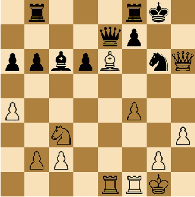 1.e4 Cc6 2.d4 d6 3.Cf3 Cf6 4.Cc3 g6 5.d5 Cb8 6.Ae3 Ag77.Dd2 h6 8.h3 a6 9.a4 b6 10.Ac4 Ab7 11.Cd4 c5 12.dxc6Cxc6 13.Cxc6 Axc6 14.f3 Dc7 15.Ab3 Tb8 16.O-O h5 17.Dd3Db7 18.Tae1 O-O 19.e5 Cd7 20.Dxg6 Cxe5 21.Dxh5 e622.Ah6 De7 23.f4 Axh6 24.Dxh6 Cg6 25.Axe6