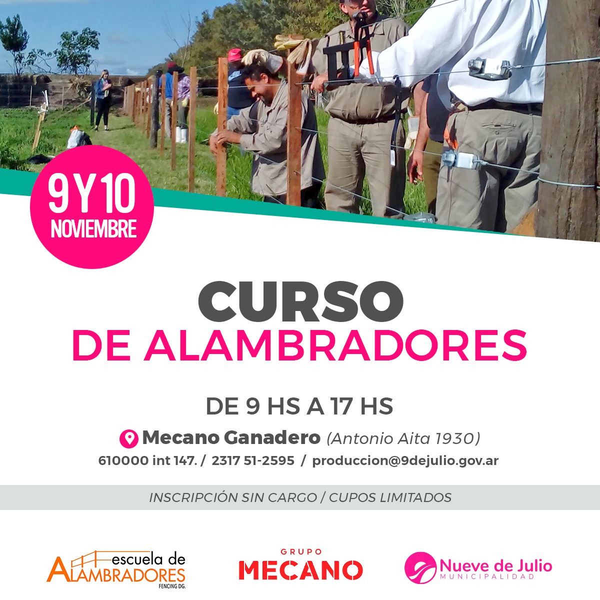 La Municipalidad de Nueve de Julio, a través de la Subsecretaría de Producción, y conjuntamente con la Escuela de Alambradores Fencing DG y Grupo Mecano, dictará un curso de alambradores, los días sábado 9 y domingo 10 de noviembre, de 9 a 17 hs., en las instalaciones de Mecano Ganadero, ubicadas en Antonio Aita 1930.