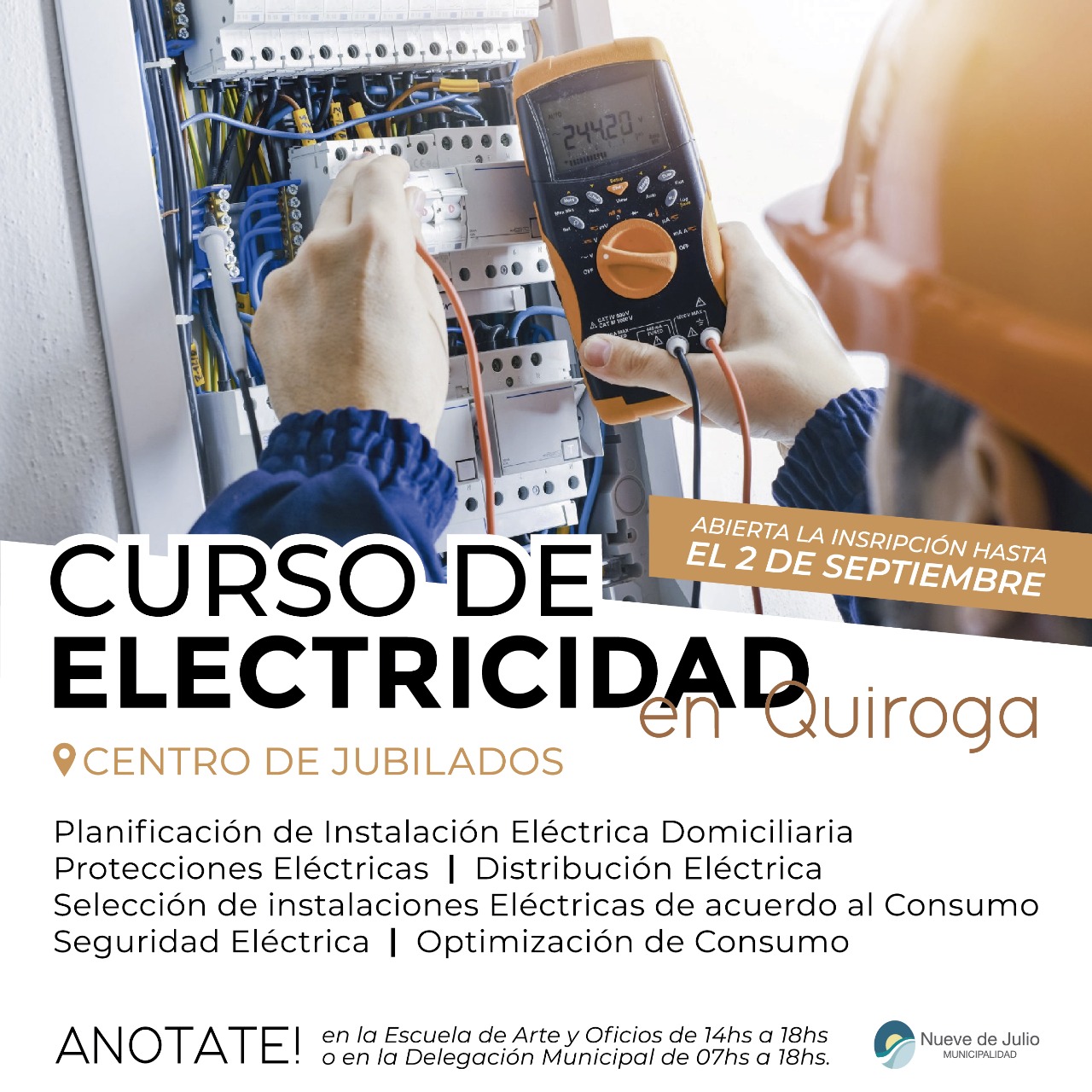 Desde la Dirección de Educación de la Municipalidad de Nueve de Julio, y en el Centro de Jubilados de la localidad de Facundo Quiroga, se dictará un interesante curso de electricidad, el que abarcará diferentes aspectos tales como planificación de instalación eléctrica domiciliaria, protecciones eléctricas, distribución eléctrica, selección de instalaciones eléctricas de acuerdo al consumo, seguridad eléctrica y optimización de consumo.