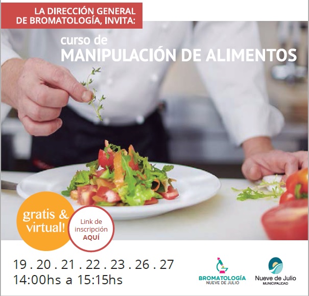 La Dirección de Bromatología de la Municipalidad de Nueve de Julio invita a la comunidad en general a sumarse al curso virtual de manipuladores de alimentos a dictarse en Modalidad Virtual entre los días: 19 y 27 de abril de 2021 en el horario 14: 00 a 15:15 hs., con examen final también en modalidad virtual.
