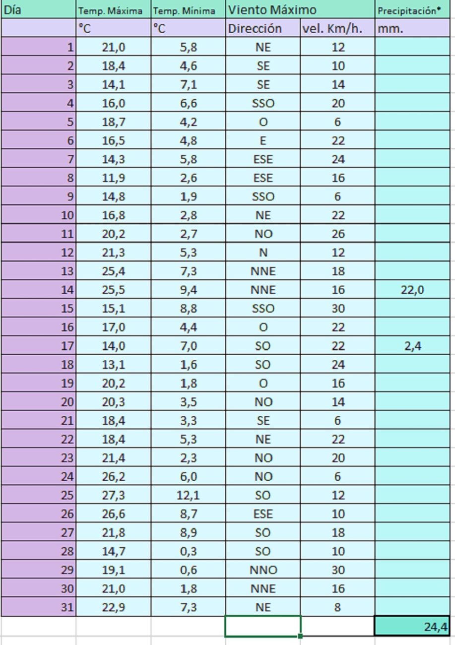 Datos brindados por la estación meteorológica 9 de Julio. La precipitación corresponde al día pluviométrico meteorológico, el cual corresponde desde las 9 hs del día 1 hasta las 9 hs del día 2.