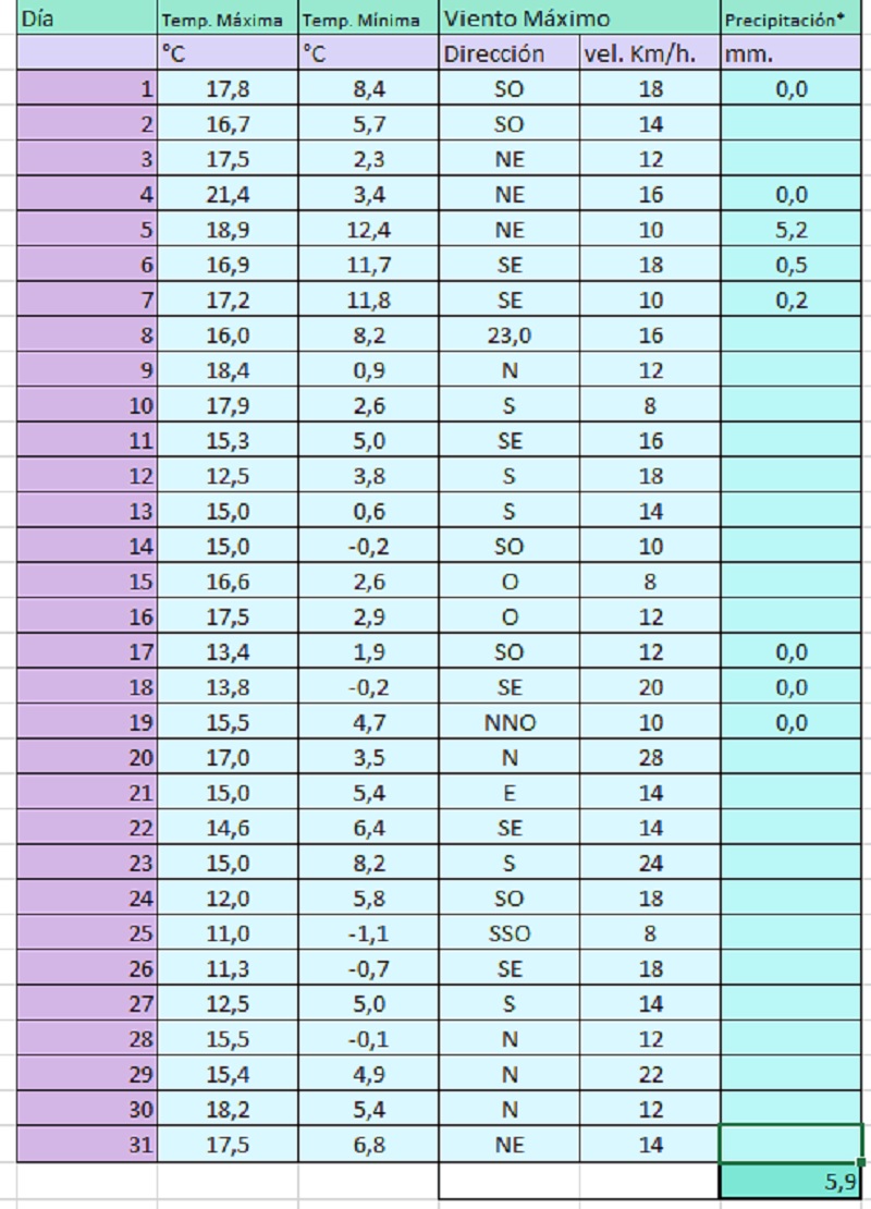 Datos brindados por la estación meteorológica 9 de Julio. La precipitación corresponde al día pluviométrico meteorológico, el cual corresponde desde las 9 hs del día 1 hasta las 9 hs del día 2.