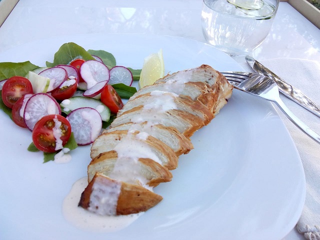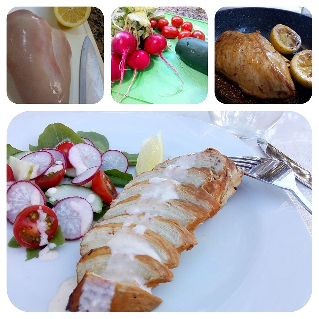 Dorar la pechuga de pollo en una sartén con aceite de oliva, agregarle el vino, dejar que se evapore, incorporar el jugo de 1 limón, sal y pimienta y tapar. Cocinar a fuego bajo hasta que este cocida por completo. Realizar una ensalada con los rábanos, pepinos, cherry y las hojas verdes. Aderezar con mayonesa reducida con jugo de limón.