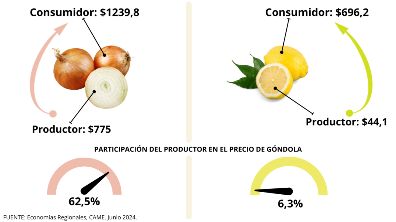 En promedio, la participación del productor explicó el 31,1% de los precios de venta final, cayendo un 9,6% con respecto a mayo. La mayor participación la tuvieron los productores de cebolla (62,5%), mientras que la menor fue nuevamente para los de limón (6,3%).