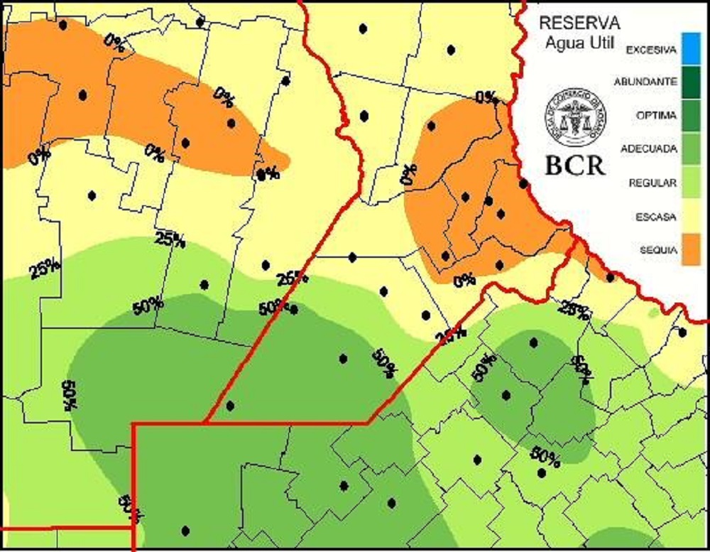 Las áreas con escasez y sequía son un 60% de la región. Esta zona barca a parte del norte bonaerense, centro sur santafecino y el centro este cordobés. En esta zona se estima pérdidas de rindes del orden del 30%, “pérdidas irrecuperables”, advierten los ingenieros del área. Y el cultivo puede perder aún mucho más si no llueve.