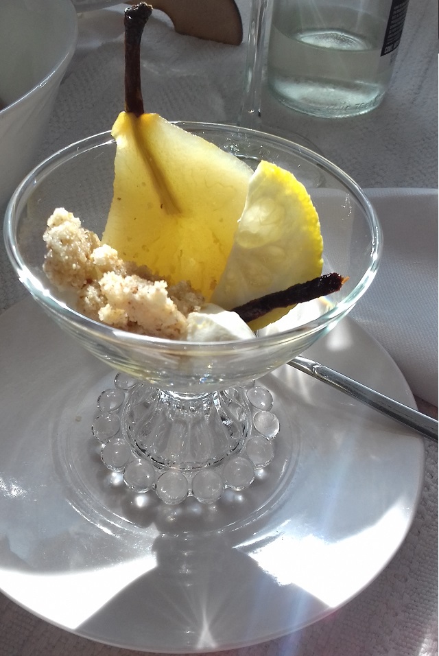 Calentá el azúcar con el agua hasta que se derrita, agrega el jugo de limón y las especies. Mové para incorporar todo y agrega el vino blanco. Agrega las peras sin cascaras en el jarabe, tapalas con papel manteca y dejalas cocinar por 15 minutos a fuego bajo. Enfriarlas en su jugo tapadas y servir en compoteras con un toque de queso crema y trozos de crumbel hecho con partes iguales de harina, azúcar y manteca. Unirlo con los dedos dejando trozos de manteca. Cocínalo en horno medio por unos minutos. Tiene que quedar seco y crocante.