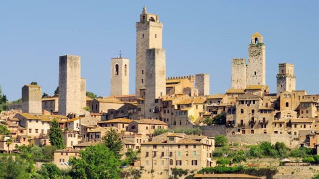 San Gimignano es un pueblo medieval amurallado, un verdadero museo al aire libre. Fundado como un pequeño pueblo en el siglo III a. C. por los etruscos, su historia más esplendorosa comienza en el siglo X, cuando adopta el nombre del obispo San Geminiano, que la había defendido de los hunos de Atila. En la Edad Media y el Renacimiento, era un punto de parada para los peregrinos católicos en su camino al Vaticano. El pueblo se mantiene intacto y la localidad presenta aún hoy uno de los mejores ejemplos europeos de organización urbana del siglo XIV, aún conserva 15 de las 72 torres iniciales, las iglesias de la Colegiata y San Agustín, el Palacio Municipal o la Torre Grossa que se alza hasta los 54 metros de alto y hasta la que se puede acceder como ocurre con el resto de torres Toscanas.
