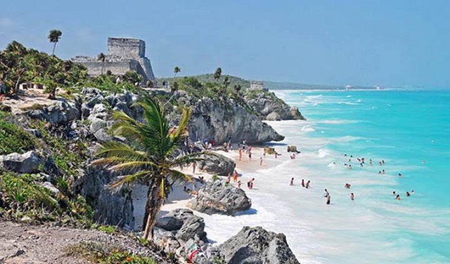 -Ruinas arqueológicas en la playa y en la selva. A 65 km. se levanta Tulum, otra fortaleza maya cuyo apogeo fue cerca del año 1000, en el período clásico de esta civilización. La más célebre de las construcciones, llamada El Castillo, se levanta sobre un acantilado que mira hacia el prístino mar Caribe, conformando una postal única. De manera que después de visitarla bien vale un momento de relax en la playa.