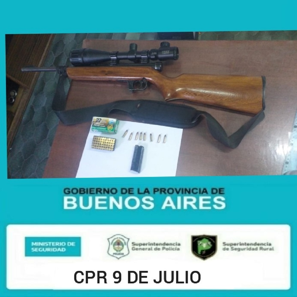 El Comando de Prevención Rural 9 de Julio informa que en el día Sábado, en cumplimiento operativo en vigencia, con especial interés en el control de la caza furtiva, procedió a la detención de una persona del sexo masculino, mayor de edad, quien se encontraba cazando con un arma de fuego en zona rural de La Niña, quien al ver la presencia policial se da a la fuga, siendo interceptado metros después por personal policial, logrando su detención y secuestro de una carabina calibre 22, de la cual causante no poseía documentación. Por lo que se procedió a conducirlo hacia el asiento de este comando de Prevención Rural fines recaudos legales poniéndose a disposición de la Fiscalía Nro. 4 del Dpto Judicial Mercedes, labrándose actuaciones por RESISTENCIA A LA AUTORIDAD Y TENENCIA ILEGAL DE ARMA DE FUEGO DE USO CIVIL.