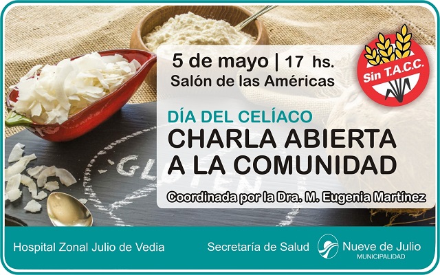 Con la organización de la Secretaría de Salud de la Municipalidad de Nueve de Julio y el Hospital “Julio de Vedia”, el próximo viernes 5, a las 17 hs., y en el Salón de las Américas del Palacio Municipal, se desarrollará una interesante charla abierta a la comunidad, la que se asociará a la conmemoración del Día del Celíaco.