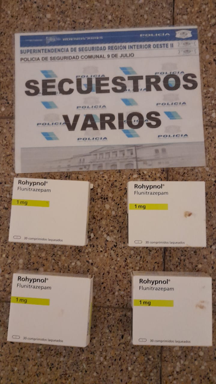 Ayer, alrededor de las 20 horas, personal policial de la Estación de Policía de 9 de Julio junto a personal de la SUB DDI Bragado, se constituye en farmacia emplazada en calle Mitre 2300 este medio, donde al entrevistarse con la farmacéutica del lugar, esta informa que momentos antes dos sujetos se habían presentando en el lugar con un recetario apócrifo intentando comprar Rohypnol Flunitrazepam 1mg a lo que se niega a venderle, posteriormente ambos sujetos se dan a la fuga a bordo de un taxi de Capital Federal (color negro y amarillo). Realizado el rastrillaje con la colaboración de las cámaras Municipales se logra interceptar el taxi en calles Mitre e Yrigoyen, el mismo era conducido por un masculino de 56 años acompañado por un masculino de 59 años ambos oriundos de Capital Federal. Requisado el interior del rodado, se incauta dinero en efectivo, recetarios médicos apócrifos para compra del medicamento arriba citado con sello y firma apócrifa de médico psiquiatra, cajas del medicamento Rohypnol Flunitrazepam 1mg conteniendo cada caja 30 comprimidos los cuales de averiguaciones practicadas las habrían comprado en la víspera en horas de la tarde en las localidades de Suipacha y Bragado, como así también se incautan dos celulares de interés para la causa. Dicho medicamento es utilizado para dormir y en muchos casos se usa en violaciones sexuales ya que hace que la víctima sea incapaz de ofrecer resistencia presentando pérdida de control muscular, confusión, somnolencia y amnesia durando el efecto entre 8 y 12 horas, y al despertar la víctima no recuerda nada de lo sucedido. Los masculinos se encuentran detenidos por los delitos de Infracción al Artículo 29 de la Ley 23.737; Infracción Articulo 427 del C.P- Falsificación de Recetas Médicas y Uso de Documento Privado Falso a disposición de la UFI 3 de Mercedes.