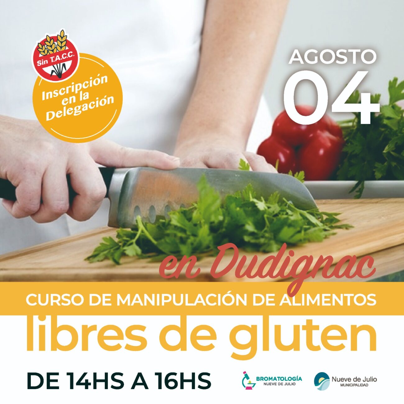 La Dirección de Bromatología de la Municipalidad de Nueve de Julio invita a un curso de manipulación de alimentos libres de gluten, que se dictará el día viernes 4 de agosto de 14 a 16hs., en la localidad de Dudignac.