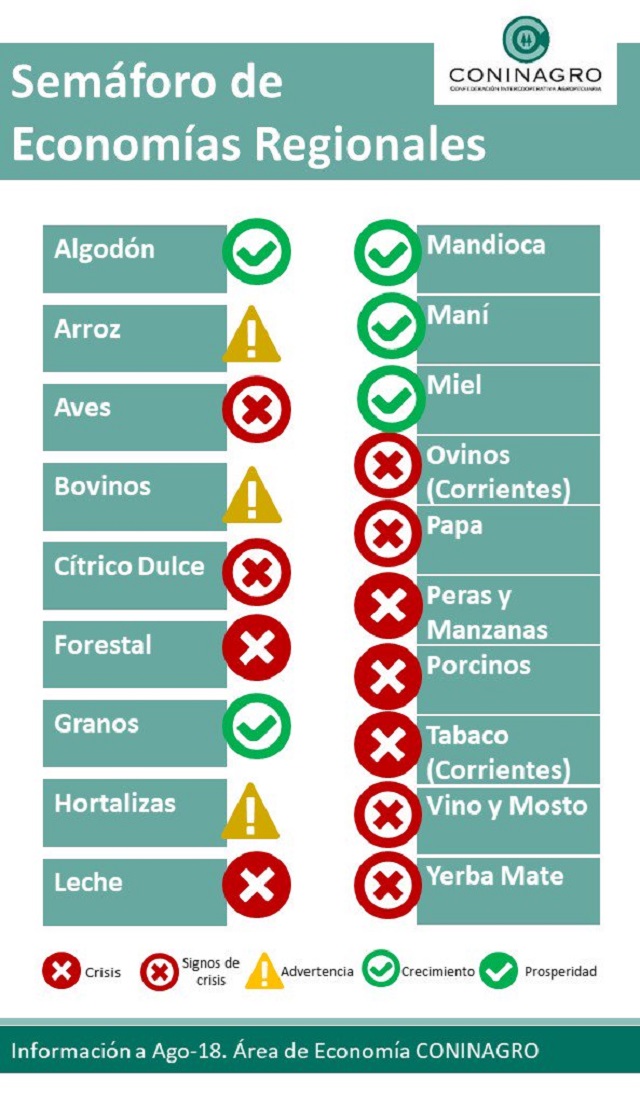 SIGNOS DE CRISIS. El Semáforo de las Economías Regionales que realiza CONINAGRO mensualmente, presentó en julio 10 sectores productivos con signos de crisis, dos menos que los registrados en junio, sobre un total de 19 actividades relevadas.