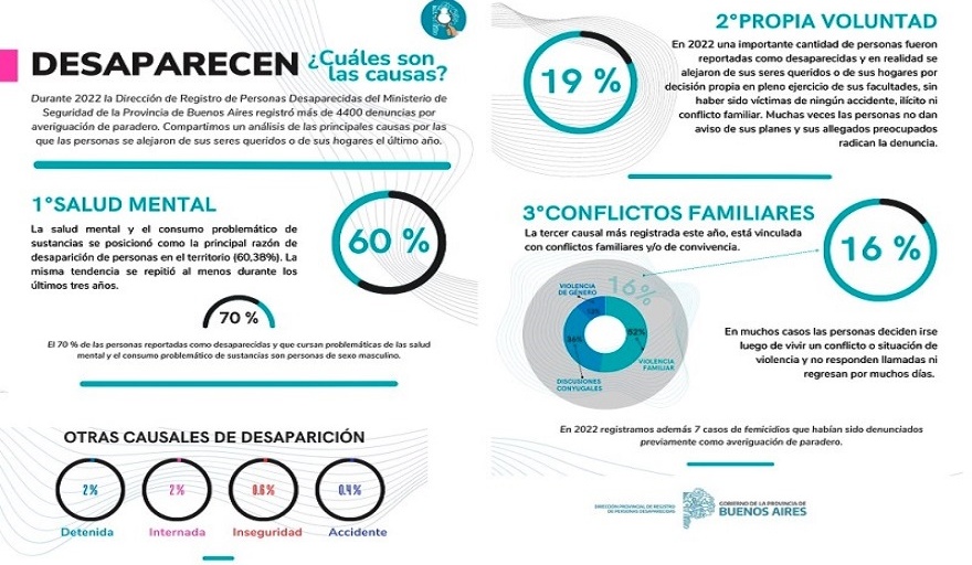 Así lo indica un informe de la Dirección de Registro de Personas Desaparecidas del Ministerio de Seguridad de la Provincia de Buenos Aires, que por tercer año consecutivo, constata que la salud mental y el consumo problemático de sustancias son las principales causas de desaparición de personas en la provincia de Buenos Aires. Le siguen los casos en los que las personas se alejan por propia voluntad, sin dar aviso a sus allegados y las disputas de índole familiar.