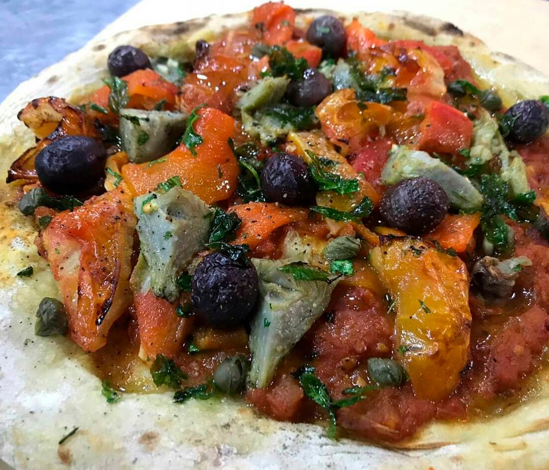 Una de las elaboraciones de Diego Cortes es la pizza de salsa pomodoro, ajo, pimientos asados y asados, alcaparras, albahaca, olivas negras y alcauciles. También se usa como relleno de empanadas.