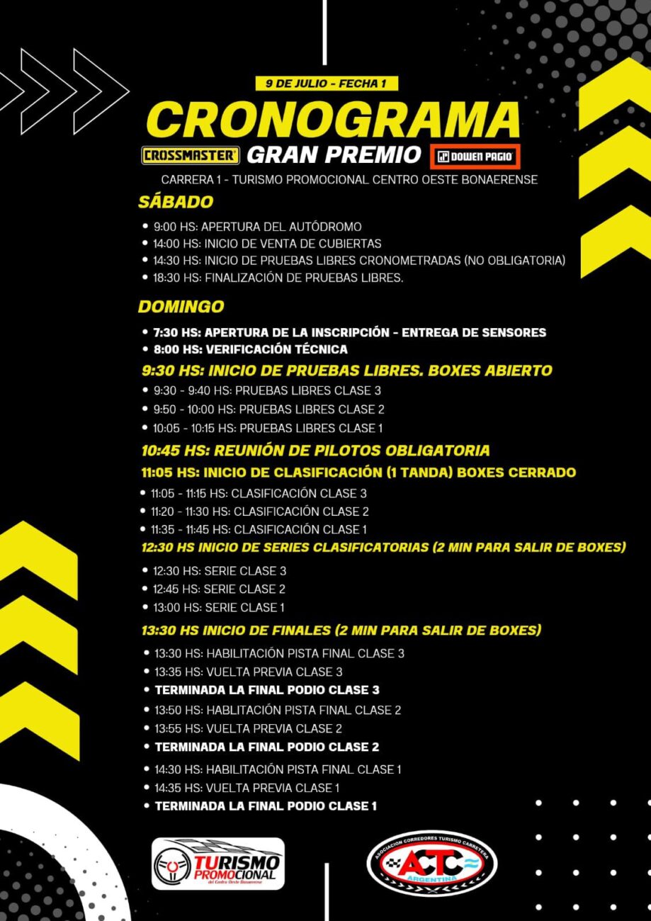 Las actividades en pista comenzarán el día sábado a partir de las 14:30 hs con los entrenamientos libres, mientras que el domingo la jornada arrancará desde las 9:30 hs con entrenamientos, clasificaciones, series y finales, cerrando con la ceremonia de premiación de la Clase 1 alrededor de las 16:00 hs.
