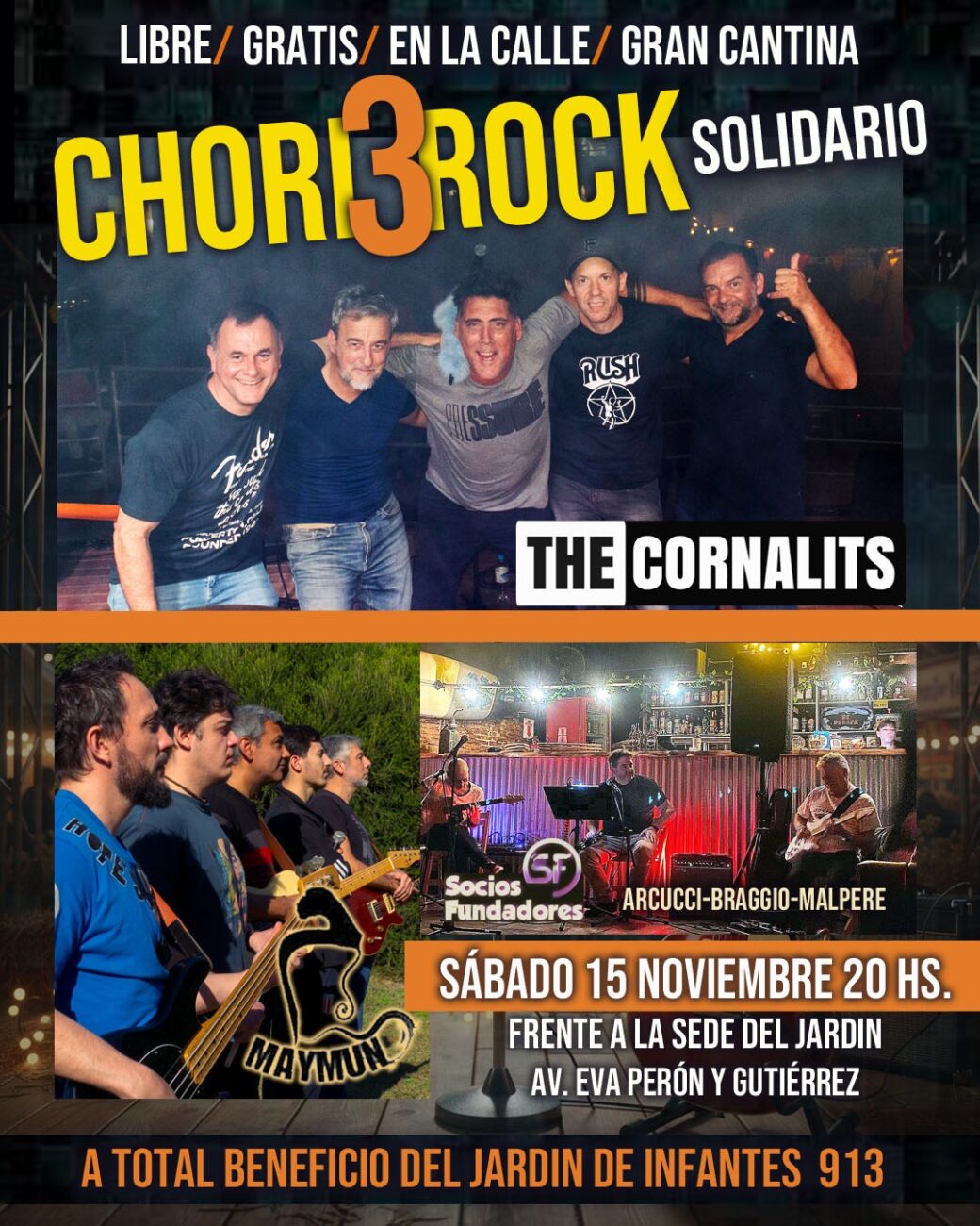 Este sábado 15 de noviembre, el Chorirock Solidario desembarca en el barrio Lujan, en una evento solidario a total beneficio del Jardín 913. El objetivo de esta tercera edición es recaudar fondos para que la institución pueda completar el trabajo de pintura interior y exterior de su sede. La cita será desde las 20, en la calle, al aire libre, en la esquina del Jardin, Eva Perón y Gutiérrez, con una gran cantina y una grilla de bandas y sorpresas musicales para acompañar la noche.