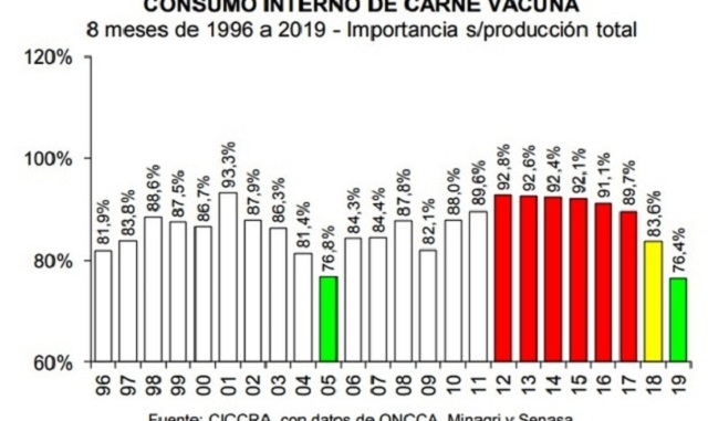 El consumo (aparente) per cápita de carne vacuna se habría ubicado en 52,4 kg/año durante agosto de 2019, al calcular el promedio móvil de los últimos 12 meses, resultado 10,0% menor al promedio de septiembre 2017-agosto 2018 (-6 kg/hab/año). En tanto, el consumo (aparente) correspondiente a los primeros ocho meses de 2019, equivalió a 51,0 kg/hab/año (-11,3% anual; -7 kg/hab/año). (InfoGEI)Jd