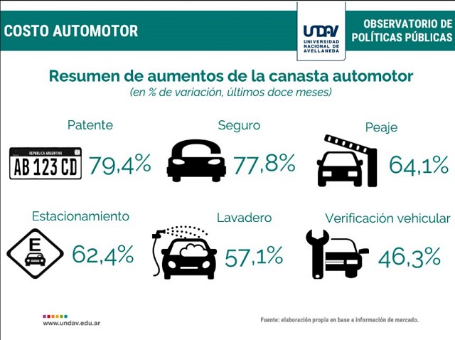 Los datos pertenecen a un reciente informe del Observatorio de Políticas Públicas de la Universidad Nacional de Avellaneda (UNDAV). El informe apunta las diferentes subas de esta canasta: la patente aumentó un 79,4%; el seguro 77,8%; los peajes 64,1%; estacionamiento 62,4%; lavadero 57,1%; y la verificación vehicular un 46,3%.