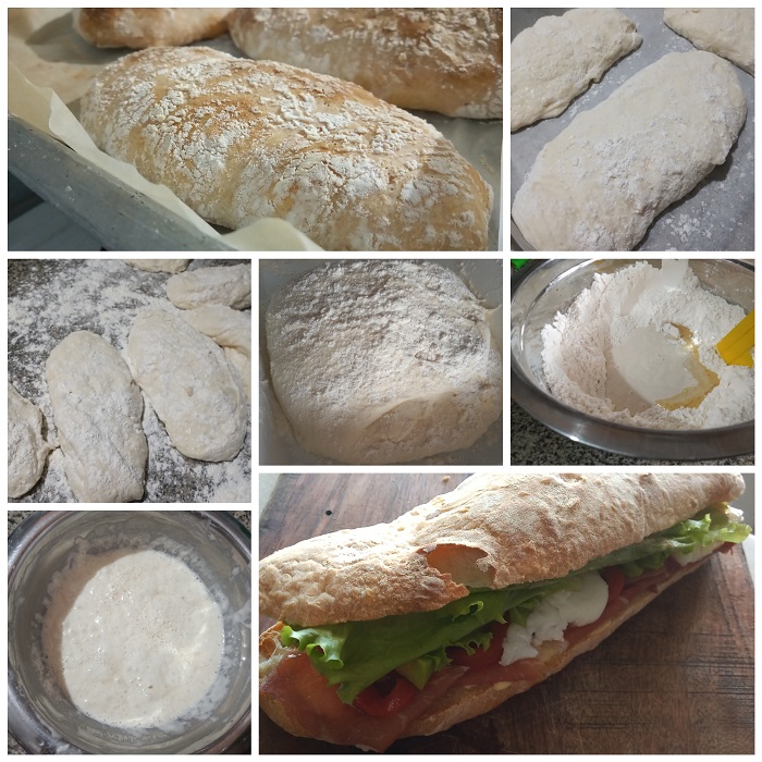 Para preparar la BIGA necesitás hacerla la noche anterior para que esta masa previa vaya tomando fuerza con muy poca levadura. A la mañana siguiente preparas todos los ingredientes junto con la BIGA en porciones, amasas bien y dejas descansar en un bowl tapado. La masa es muy blanda. Dejarla leudar por 8 horas, en un lugar templado, tapada y cada hora le practicas unos dobleces con las manos con harina para que no se te pegue. Después de leudado cortas la masa en 8 porciones y la disponés en formas alargadas para formar panes largos y chatos y los cocinas en una placa con harina en la superficie de todo el pan. Cocinarlo con vapor por 35 minutos a horno alto, lo más alto que de tu horno. Es ideal para sándwich.