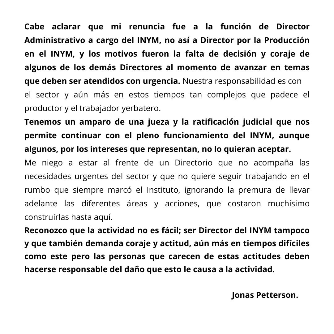 A la larga lista de disputas en el universo de la yerba mate, esta vez el desenlace del capítulo de la “presidencia” del INYM lo dio el Director a cargo Jonas Petterson. Quien después de casi 4 meses de cumplir con la función que el propio directorio le delego, renunció a esa responsabilidad. Los argumentos los detallo en sus redes sociales y fueron, por palabras escritas en su aclaración, solo a esa función y que el motivo fue “la falta de decisión y coraje de algunos de los demás Directores al momento de avanzar en temas que debían ser atendidos con urgencias”.
