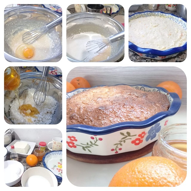 En un bowl disponemos la ricota con el azúcar, mezclamos para unir, incorporamos los huevos de a uno y las esencias junto con la manteca. Batir para forma una pasta homogénea. Por ultimo incorporamos los secos previamente tamizado. Disponemos la mezcla en una tortera para llevar a un horno a 180º por 45 minutos.