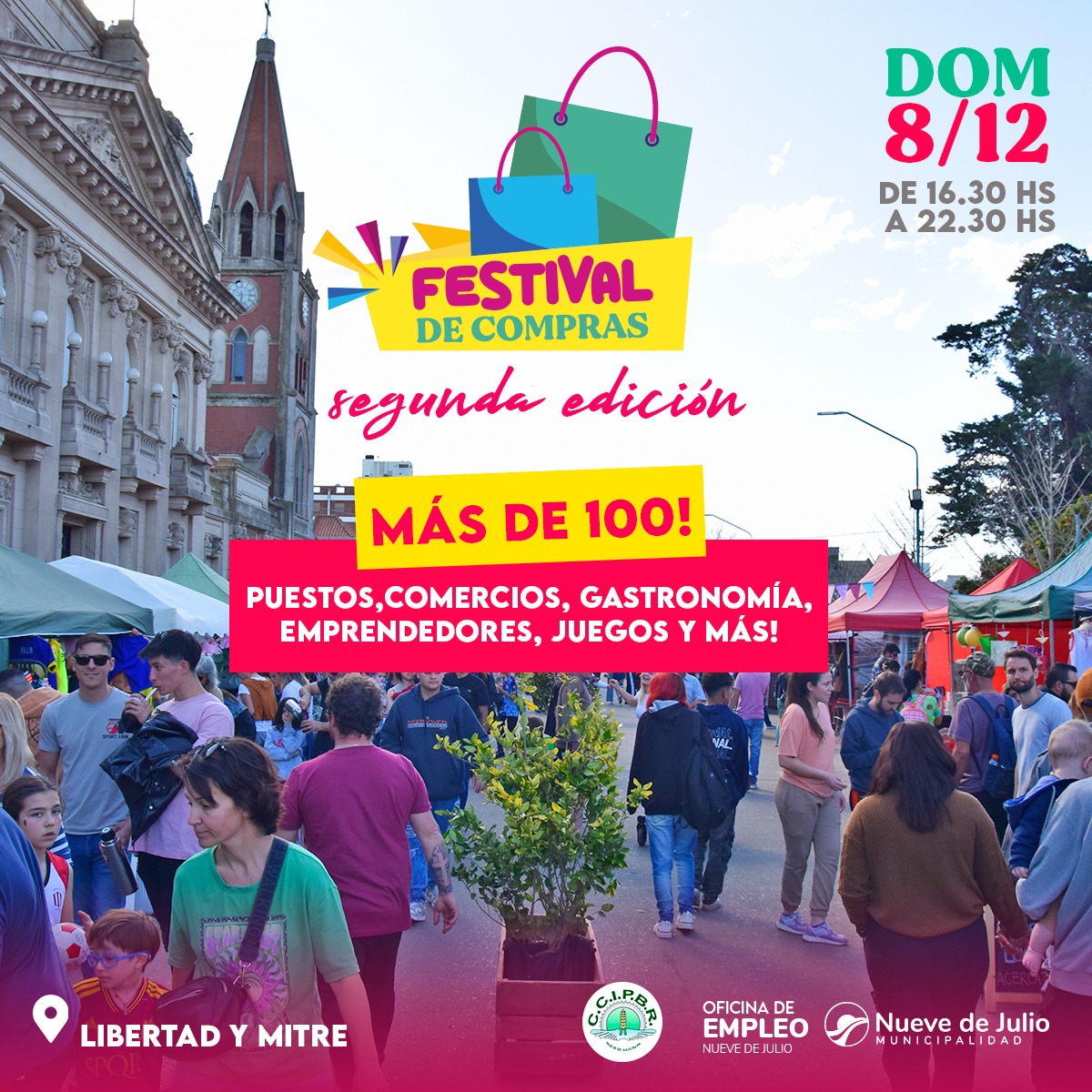 La Municipalidad de Nueve de Julio, a través de la Oficina de Empleo, y de manera conjunta con la Cámara de Comercio e Industria de nuestra ciudad, llevará adelante el “2do. Festival de Compras” este próximo 8, de 16,30 a 20,30 hs. en calle Libertad, entre Mitre y San Martín; propuesta de interés para toda la familia.