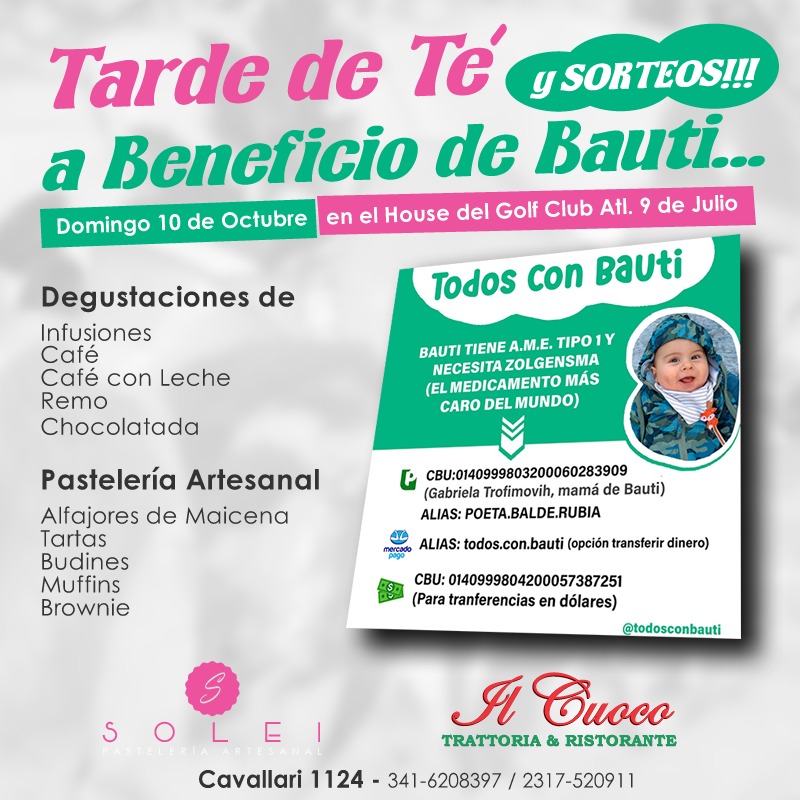 Julio Schmitd, quien tiene a su cargo el servicio del House, detalló que será una brillante tarde para compartir con amigos y la familia en un excelente lugar al aire libre con degustaciones de infusiones de te, café , café con leche, remo y chocolatada, lo que será acompañada con excelente pastelería artesanal que se produce en el House Golf 9 de Julio, y donde todo lo recaudado se suma a #TodosConBauti, informó.