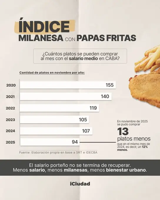 Los números muestran un deterioro claro. En noviembre de 2025 un trabajador promedio podía comprar 94 milanesas con su salario mensual, lo que implica una caída del 12,1% respecto de noviembre de 2024, cuando el sueldo alcanzaba para 107 platos. También representa una baja frente a noviembre de 2023, cuando el indicador marcaba 105.Se trata, además, del nivel más bajo para un mes de noviembre desde que existen registros comparables, lo que confirma una tendencia descendente del poder de compra en los últimos años.