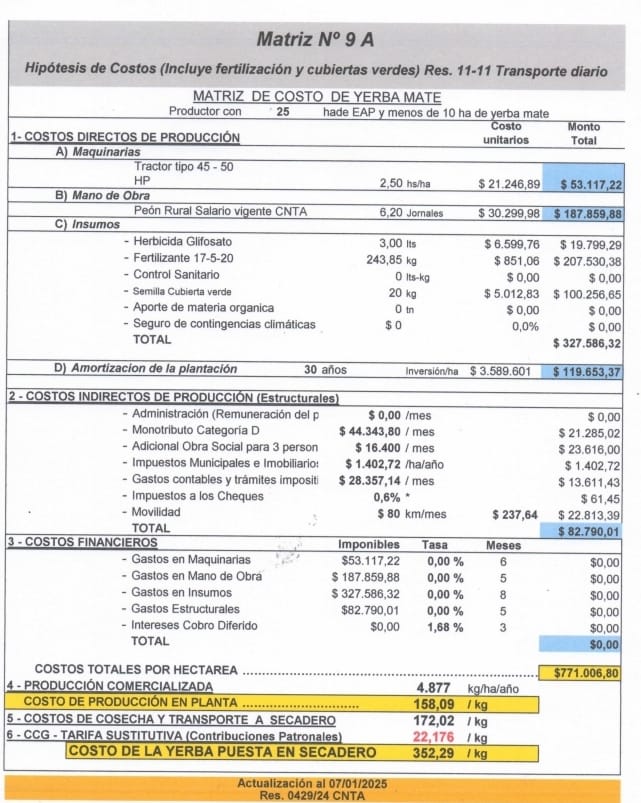 El costo obtenido se basa en el modelo de un productor con una explotación agropecuaria de 25 hectáreas, de las cuales menos de 10 hectáreas están dedicadas a la yerba mate, con un rendimiento promedio de 4.877 kg/ha. La matriz considera el uso de herbicidas, fertilizantes y cubiertas verdes, con valores de insumos actualizados a principios de enero, el costo de mano de obra según la última publicación de la Comisión de Trabajo Agrario y el valor de la Tasa Sustitutiva del CCG, vigente a partir del 1 de febrero de 2025.