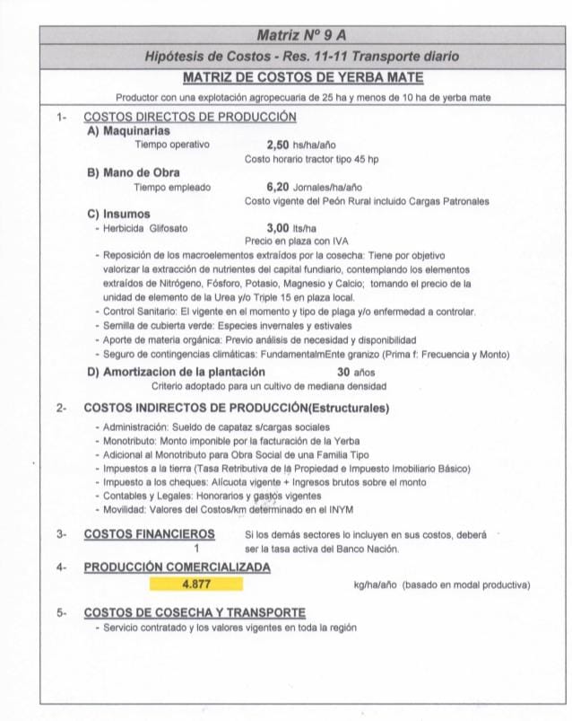 Pese al estado latente de “Condición Crítica” que padece el Instituto Nacional de la Yerba Mate desde la desregulación de sus funciones, los directores por la Producción difundieron su histórica Grilla de Costos.