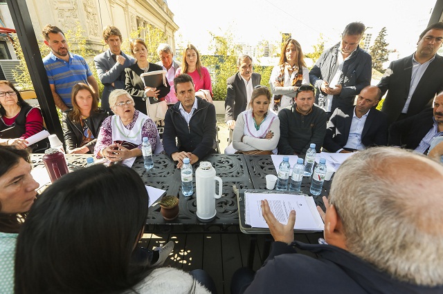 Sergio Massa y legisladores provinciales del Frente Renovador compartieron un encuentro con docentes en la Legislatura bonaerense, en el marco de la sesión especial en la cual será votado el Proyecto de Ley que exige declarar la emergencia edilicia escolar “con la finalidad de solucionar en forma urgente los problemas de infraestructura existentes, realizando las obras tendientes a una prestación segura de los servicios esenciales de los edificios escolares”.