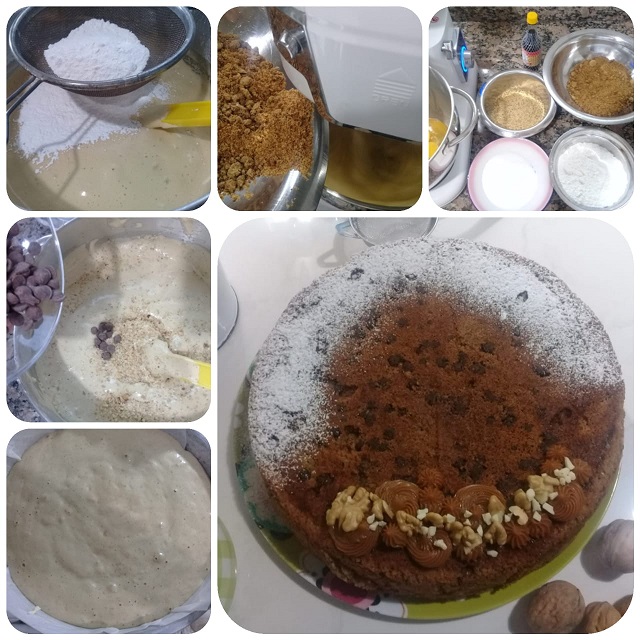 Batir los huevos con el azúcar. Yo utilicé 50gr de azúcar común y 150gr de azúcar mascabo, es igual, solo le va a cambiar el color. Batir por 10 minutos hasta el punto letra (cuando levantás el batidor y podes escribir con la preparación). Agregar la harina y las nueces procesadas, cuidando de batir en forma envolvente tratando de que la preparación no baje su volumen de aire adquirido en el batido. Por ultimo agregar la esencia y los chips. Llevar en placa enmantecada a un horno medio a 170° por 35 minutos o hasta que introduzcas un palito y salga seco. Yo la decoré con dulce de leche y nuez y otra parte con azúcar impalpable. Es muy esponjosa y húmeda. Ideal para los mates de estos días de otoño. No te la pierdas!